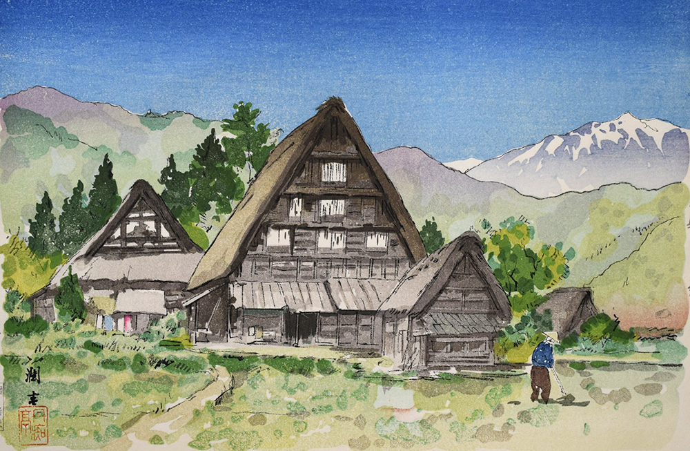 | 向井潤吉 山峡晩春(飛騨白川郷)岐阜県五月 (木版 版上サイン・印) [画寸法 230×350mm] 1964年作 JUNKICHI MUKAI |