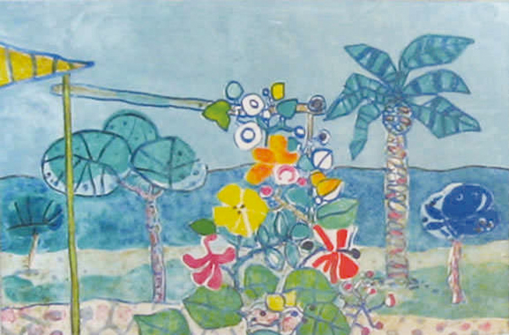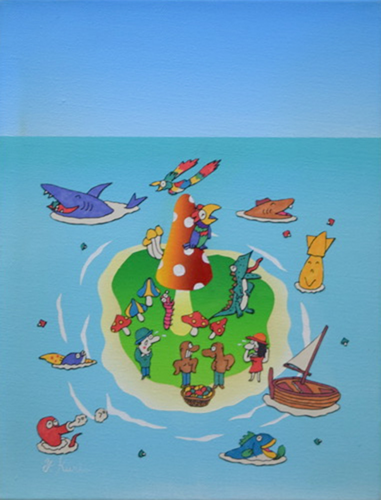 | 久里洋二 きのこの島 海と島のファンタジーシリーズ (キャンバス・アクリル画・画用紙・油性インク・コラージュ 5号)1995年作 自筆証明書 YOJI KURI |