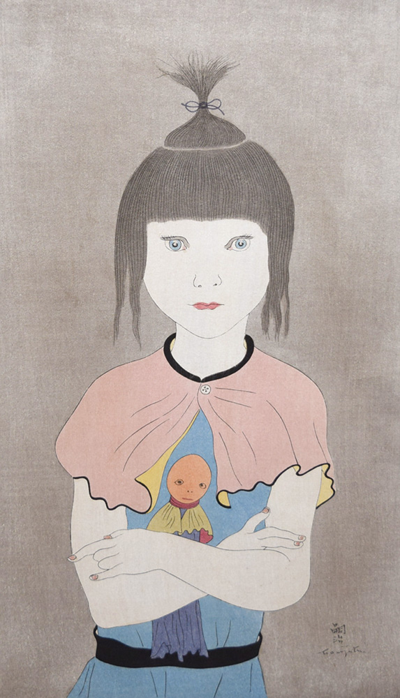 | 藤田嗣治 人形を抱く少女 (木版 版上サイン) [画寸法 380×250mm] 1930年頃作 TSUGUHARU FUJITA |
