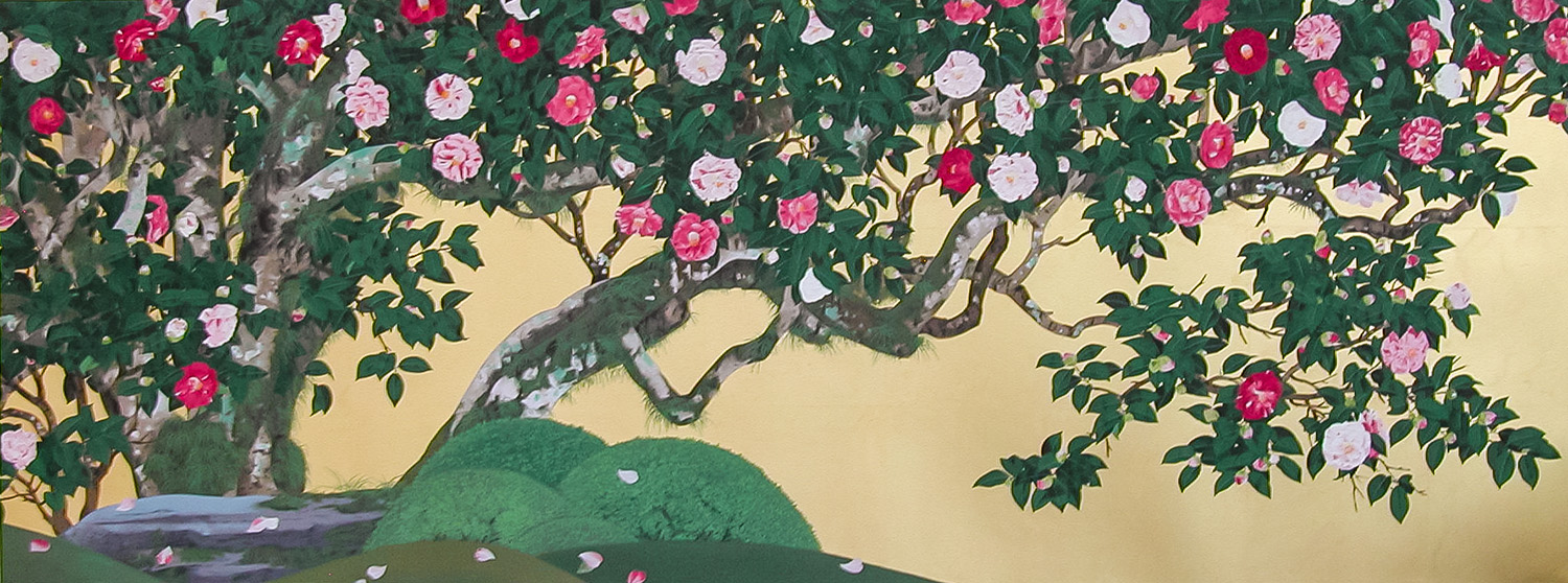 | 森田りえ子 柊野五色椿 SOLD OUT (手張り本金箔・シルクスクリーン) [画寸法 360×960mm]2011年作 RIEKO MORITA |