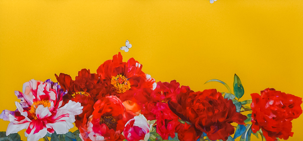 | 祖母松園の晩年暮らした奈良、平城山(ならやま)の先生のアトリエに訪れる小島たちと季節の移ろいを描いた「四季花鳥図」は、2010年にオープンした大阪新歌舞伎座の緞帳の為の原画として制作されました。 「鳥の気持ちを、声を描きたい。生命の輝き、それを謳歌する鳥の歓びを描きたい。」そんな先生の願いが込められた代表作です。 |